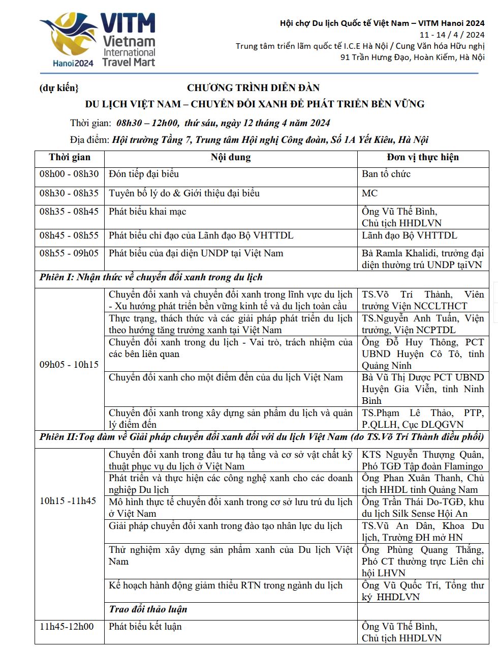 Đây là một sự kiện quan trọng diễn ra vào ngày 12 tháng 4 năm 2024 tại Hà Nội. Với sự tham gia của các chuyên gia hàng đầu trong lĩnh vực du lịch và môi trường, diễn đàn nhằm mục đích tạo ra một diễn đàn chất lượng để thảo luận và đề xuất các giải pháp cụ thể nhằm thúc đẩy sự chuyển đổi xanh trong ngành du lịch của Việt Nam. Các phiên thảo luận sẽ tập trung vào nhận thức về chuyển đổi xanh, giải pháp và mô hình thực tiễn cũng như vai trò của các bên liên quan. Sự kiện này không chỉ là cơ hội để chia sẻ kiến thức mà còn để tạo ra kế hoạch hành động cụ thể, đưa du lịch Việt Nam vào hướng phát triển bền vững và thân thiện với môi trường.