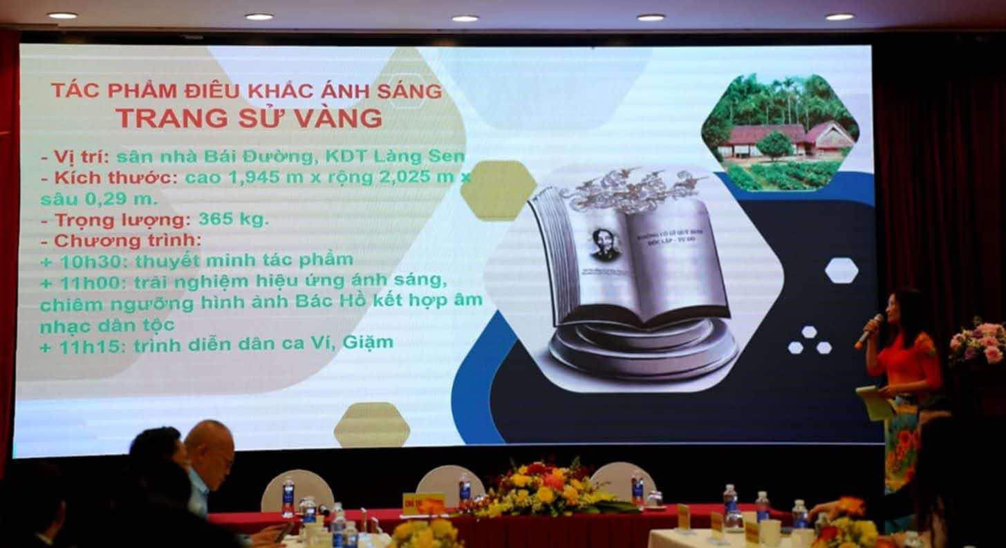 Năm 2025, Nghệ An là điểm sáng khi giới thiệu những sản phẩm mới với sự đầu tư và quy mô lớn. Đầu tiên là chuỗi lễ hội ý nghĩa nhân dịp kỷ niệm 135 năm ngày sinh Chủ tịch Hồ Chí Minh - Lễ hội Làng Sen. Điểm nhấn nổi bật của lễ hội là sự xuất hiện của tác phẩm điêu khắc “Trang sử vàng” cao 1,9m, rộng 2m đặt tại sân nhà Bái Đường, Khu Du lịch Làng Sen. Tác phẩm sử dụng hiệu ứng ánh sáng để tạo nên khoảnh khắc “chạm vào lịch sử” khi hình ảnh Chủ tịch Hồ Chí Minh xuất hiện dưới ánh sáng mờ ảo kết hợp âm nhạc dân tộc. Ngoài ra, lễ hội còn có các hoạt động như khánh thành tượng đài “Bác Hồ về thăm quê”, khánh thành công trình thác 9 tầng tại khu mộ bà Hoàng Thị Loan, không gian Sen, phiên chợ quê và chương trình nghệ thuật “Từ Làng Sen đến TP Hồ Chí Minh”.
